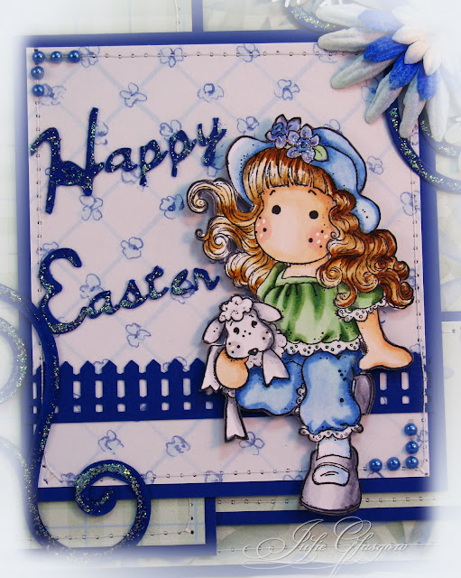 Hi Julie!! Gorgeous Easter card, m'dear!! Love the bright blues...and, of course, what's not to love about sweet little Tilda?! :-) Hugs. Pat Frank